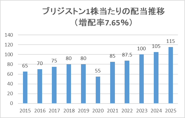 ブリジストンの過去10年間平均の増配率は7.65%です。(増配率とは?