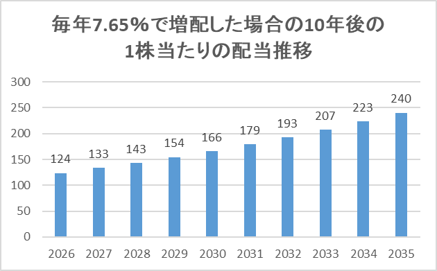 毎年同じ増配率(7.65%)で増配していくと、10年後の配当金が1株当たり年間240円になります。