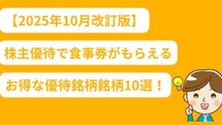 その他 外食好き必見!株主優待で食事券がもらえる10銘柄【2025年10月改訂版】 外食が高いと感じる方必見!株主優待で「ガスト」「かっぱ寿司」「丸亀製麺」などの食事券がもらえるおすすめ10銘柄を紹介。100株から購入可能で投資初心者にもわかりやすい内容です。 2025.10.12 その他