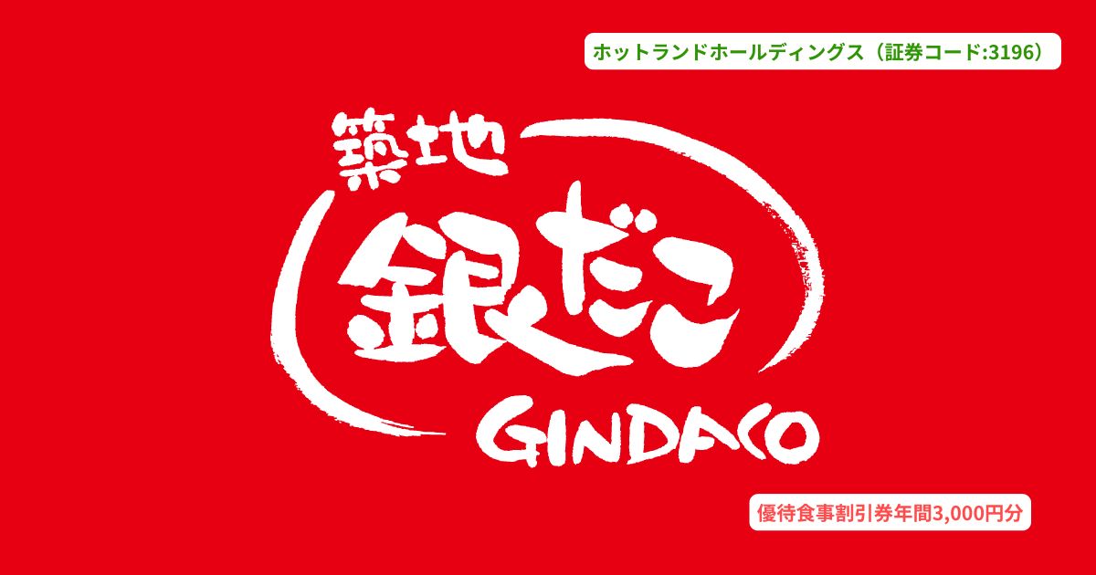 株主優待内容は、100株保有で「築地銀だこ」のほか、グループ店舗で使える優待食事割引券年間3,000円分がもらえます。