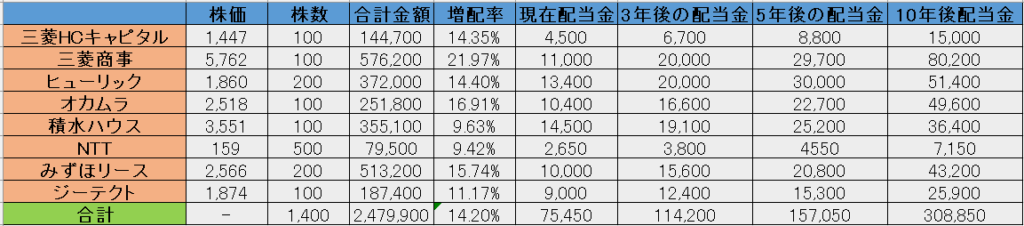 上記の表のようにこの8つの株を100~500株合計1,400株保有で2,479,900円です。