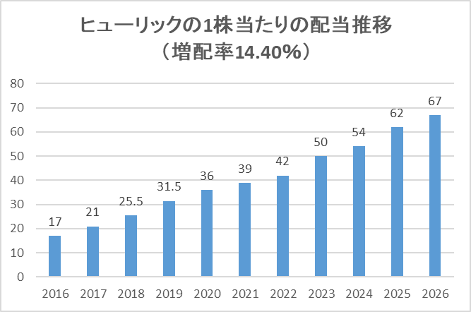 ヒューリックの過去10年間平均の増配率は14.40%です。(増配率とは?)