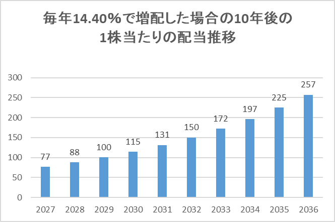 毎年同じ増配率(14.40%)で増配していくと、10年後の配当金が1株当たり年間209円になります。