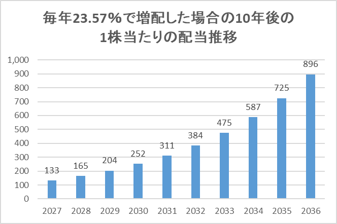 毎年同じ増配率(23.57%)で増配していくと、10年後の配当金が1株当たり年間1,043円になります。