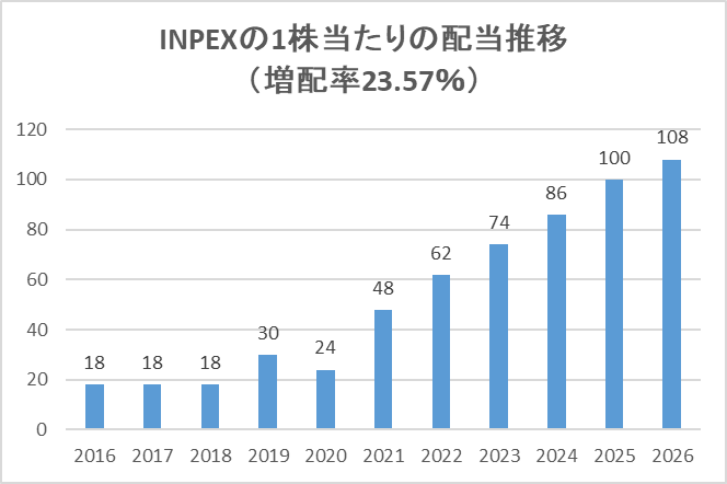 INPEXの過去10年間平均の増配率は23.57%です。(増配率とは?