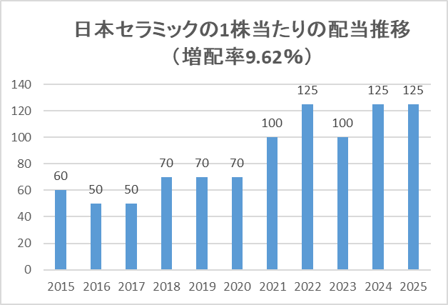日本セラミックの過去10年間平均の増配率は9.62%です。(増配率とは?)