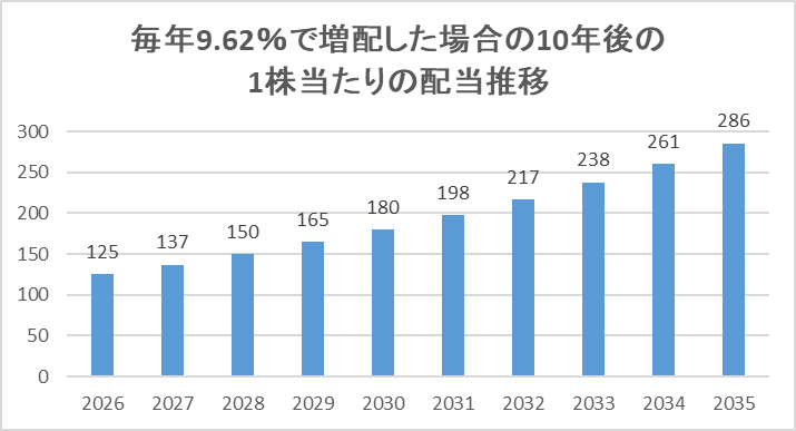毎年同じ増配率(9.62%)で増配していくと、10年後の配当金が1株当たり年間379円になります。