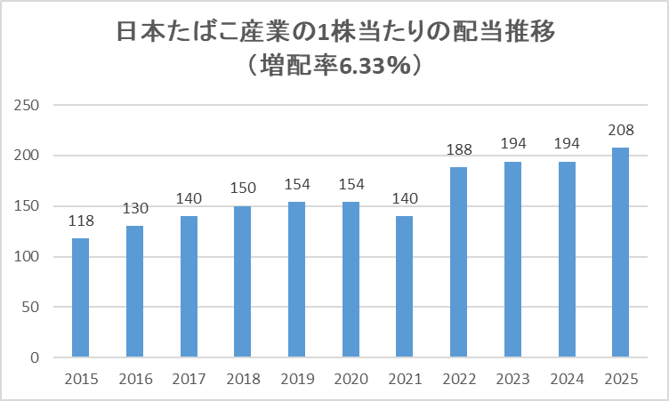日本たばこ産業の過去10年間平均の増配率は6.33%です。(増配率とは?)