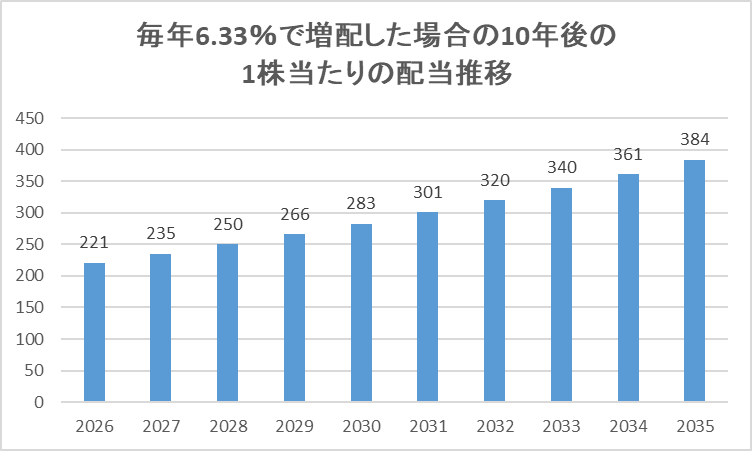 毎年同じ増配率(6.33%)で増配していくと、10年後の配当金が1株当たり年間384円になります。