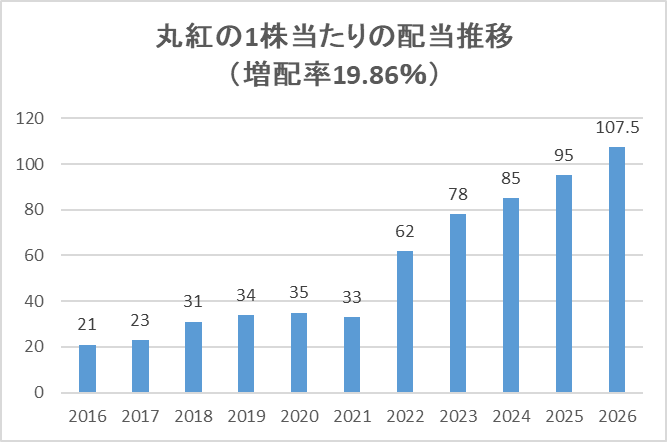 丸紅の過去10年間平均の増配率は19.86%です。(増配率とは?