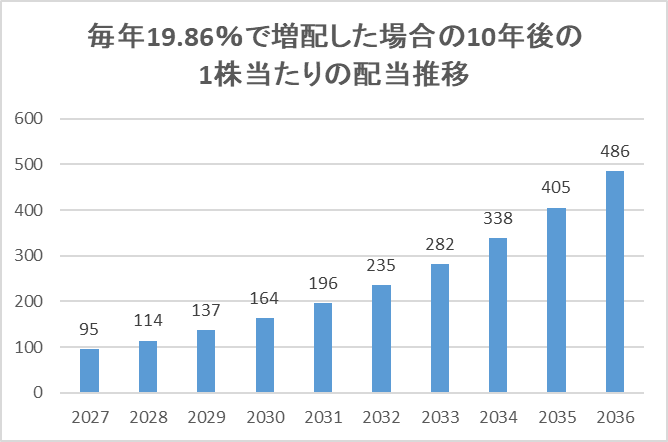 毎年同じ増配率(19.86%)で増配していくと、10年後の配当金が1株当たり年間486円になります。