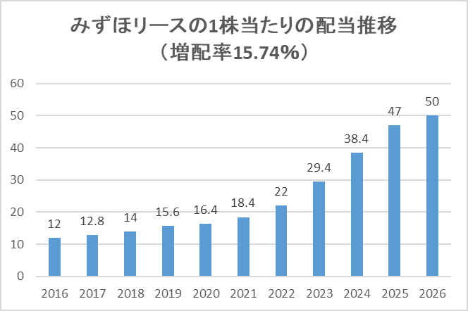 みずほリースの過去10年間平均の増配率は15.74%です。(増配率とは?