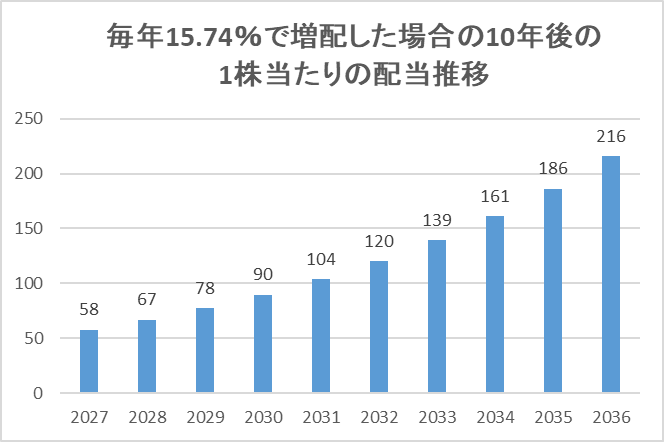 毎年同じ増配率(15.74%)で増配していくと、10年後の配当金が1株当たり年間216円になります。