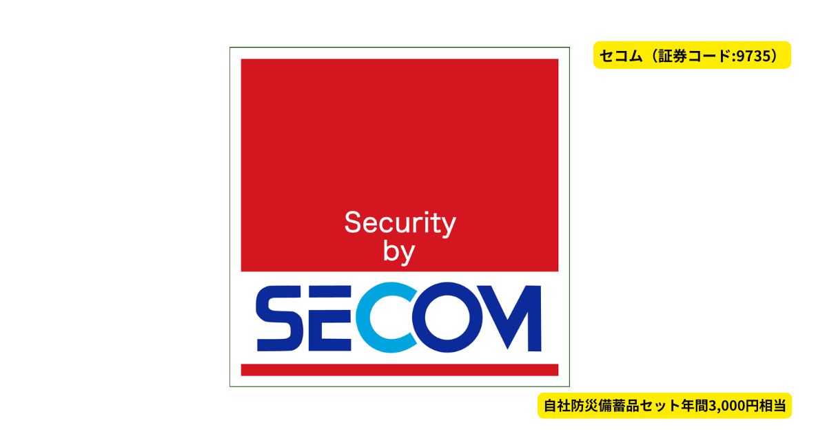 優待内容 | 自社防災備蓄品セット年間3,000円相当 (保有株数、保有期間に応じて増加) |