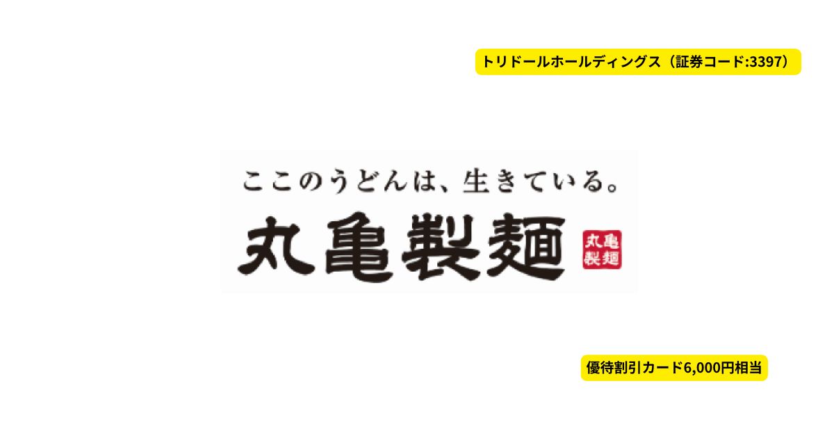 株主優待内容は、100株保有で「丸亀製麺」のほか、グループ店舗で使える優待割引カード年間6,000円分がもらえます。